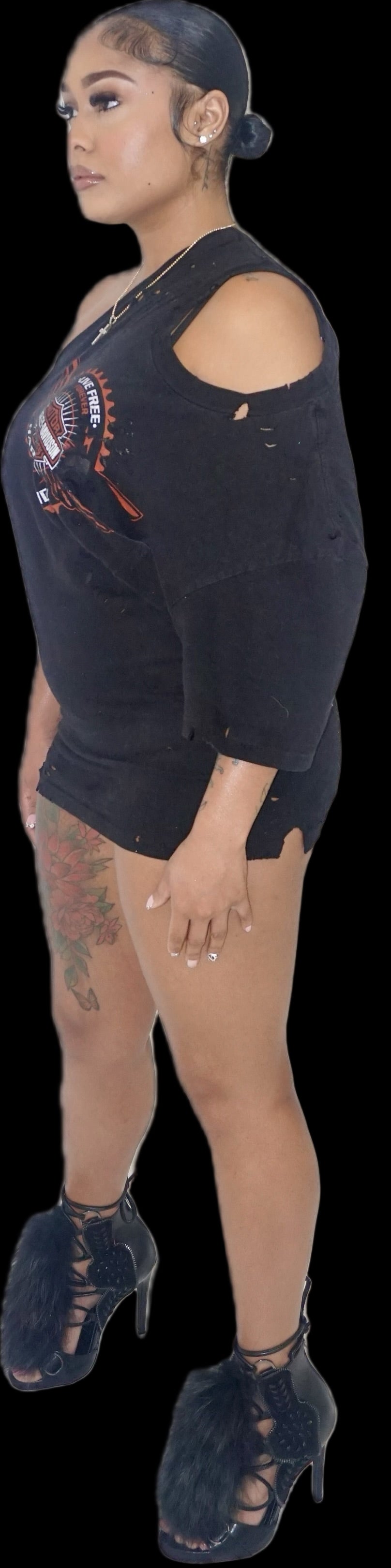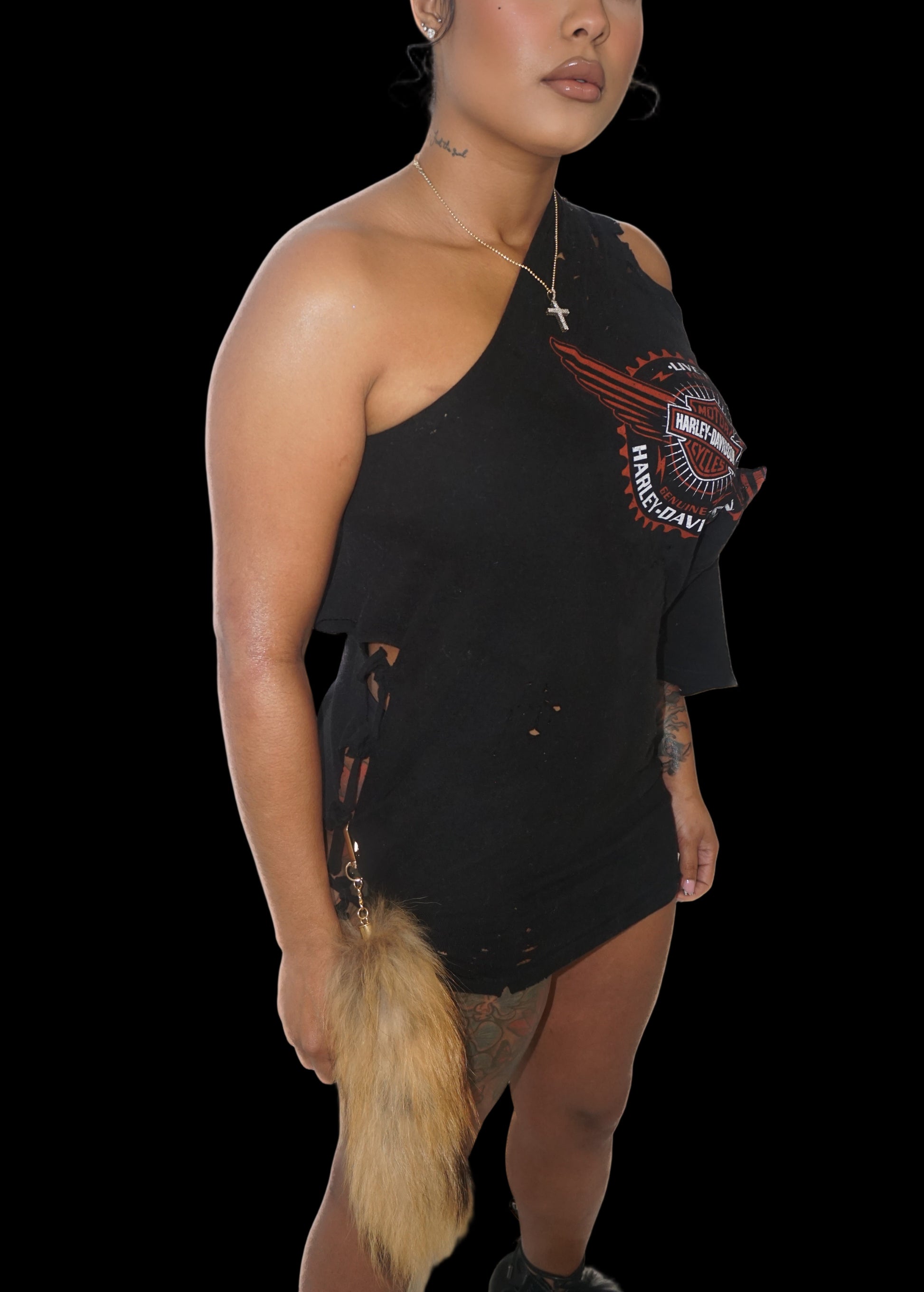 Authentic vintage Harley Davidson t-shirt reworked to fit as oversized t-shirt or mini dress. This 1of1 piece has finishing that include a rabbit tail (real fur), cut outs, and distressing.