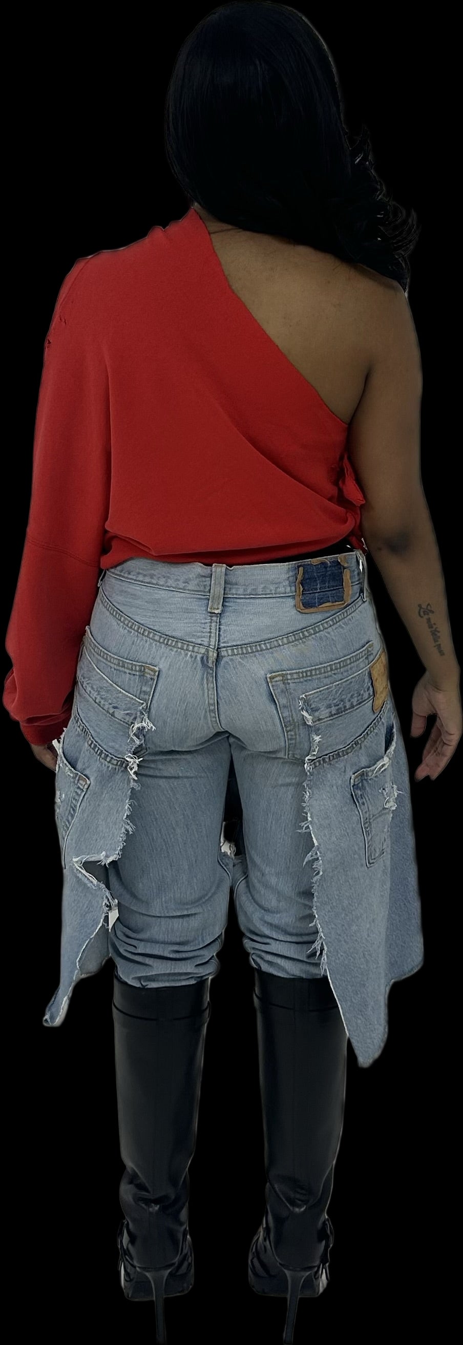 An authentic vintage Iowa State crewneck reworked to fit as an off the shoulder, single sleeve crop top that ties at one side.