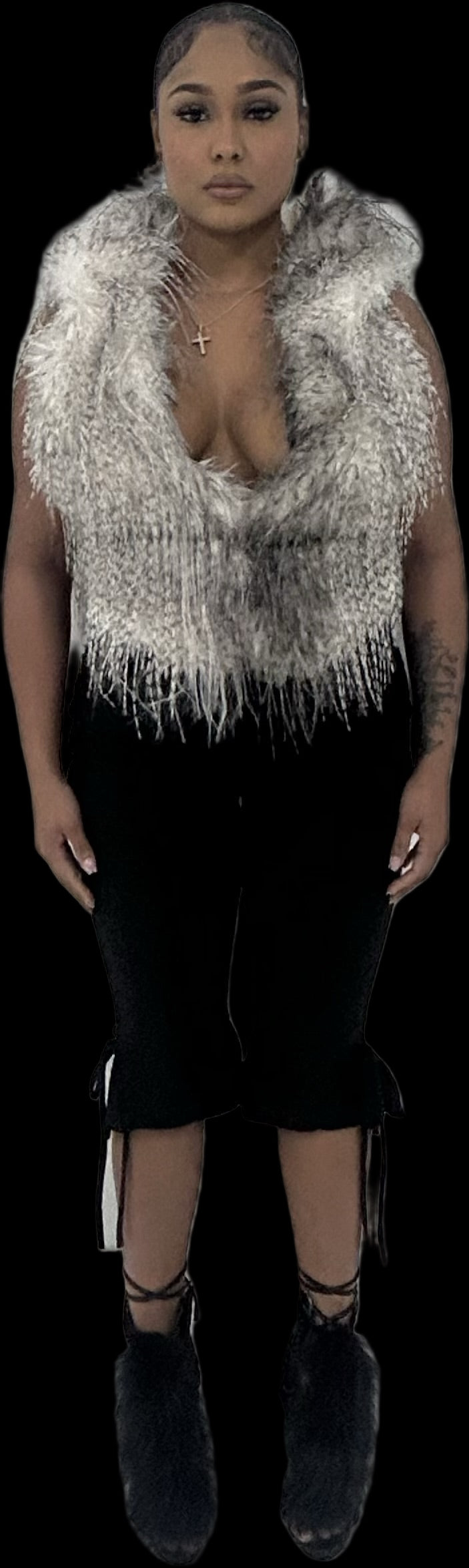 The Alps Top is a hooded fur crop top with a v neckline and exposed back that's finished with a grey leather strap. This item can fit sizes S-L.
